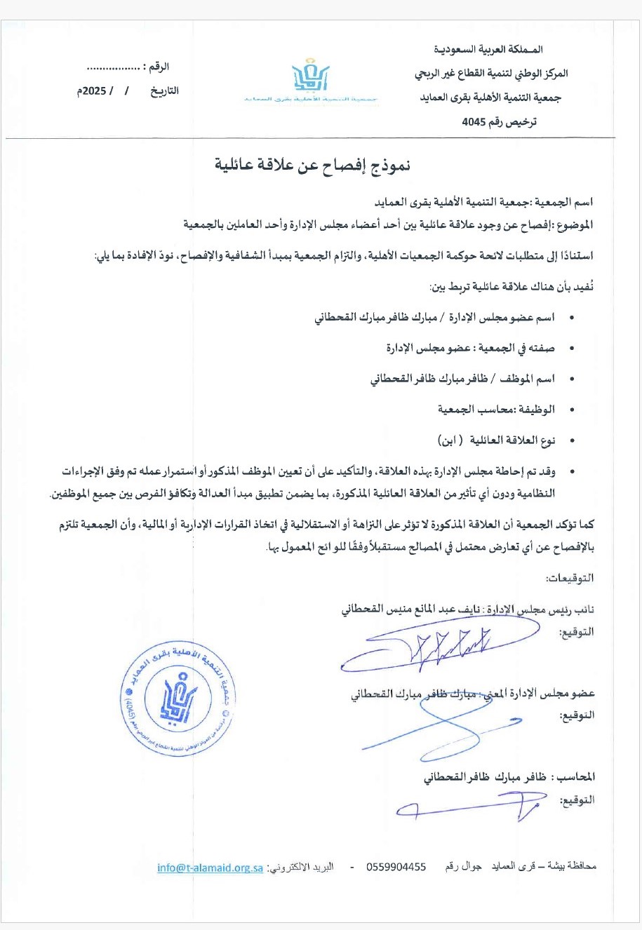 الموضوع: إفصاح عن وجود علاقة عائلية بين أحد أعضاء مجلس الإدارة وأحد العاملين بالجمعية